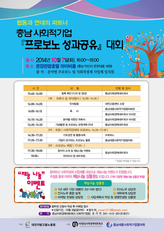 ´ëÀü°í¿ë¼¾ÅÍ¿Í (»ç)Ãæ³²»çȸ°æÁ¦³×Æ®¿öÅ©, Ãæ³²¼¼Á¾»çȸÀû±â¾÷ÇùÀÇȸ´Â ¿À´Â 10¿ù 7ÀÏ ¿Â¾ç°ü±¤È£ÅÚ¿¡¼ »çȸÀû±â¾÷ ÇÁ·Îº¸³ë ¼º°ú°øÀ¯ ´ëȸ¸¦ °³ÃÖÇÑ´Ù.