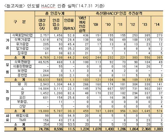 À̸í¼ö ÀÇ¿øÀº ¡°°¡Ãà»çÀ°¿¡¼ °¡°ø, À¯Åë±îÁö ¸ðµç ´Ü°è¿¡¼ HACCP¸¦ Àû¿ëÇϰí ÀÖ°í, HACCP ÀÎÁõ·üµµ ³ô¾ÆÁö°í ÀÖ´Ù.¡±¸é¼ ¡°±×·¯³ª ÃÑ ´ë»ó¾÷¼Ò 74,736°³ Áß ÀÎÁõ¾÷¼Ò 8,596°³¼Ò(ÀÎÁõÀ² : 11.5%)¿¡ ºÒ°úÇÏ´Ù.¡±¸ç ¿©ÀüÈ÷ ³·Àº ÀÎÁõ·ü¿¡ ´ëÇØ ÁöÀûÇß´Ù.