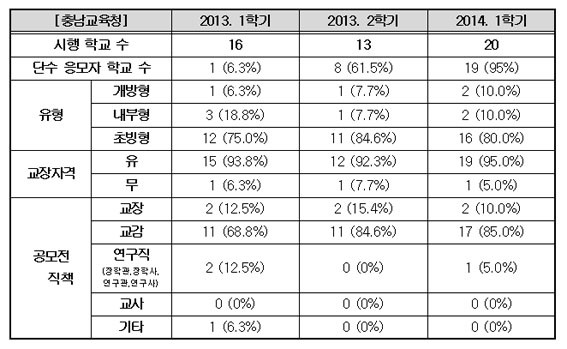 À¯ÀºÇý ÀÇ¿øÀÌ Ãæ³²/´ëÀü/¼¼Á¾±³À°Ã»À¸·ÎºÎÅÍ ¹Þ¾Æ ºÐ¼®ÇÑ ÀÚ·á¿¡ µû¸£¸é, Ãæ³²ÀÇ °æ¿ì 2013³â ÀÌÈÄ 3Çб⠵¿¾È 13~20°³±³¿¡¼ ±³Àå°ø¸ðÁ¦¸¦ ½ÃÇàÇßÀ¸³ª, ±³ÀåÀÚ°ÝÀÌ ¾ø´Â »ç¶÷ÀÌ ±³ÀåÀÌ µÈ °æ¿ì´Â °¢ Çб⺰ 1¸í(5~7%)¿¡ ºÒ°úÇß´Ù.