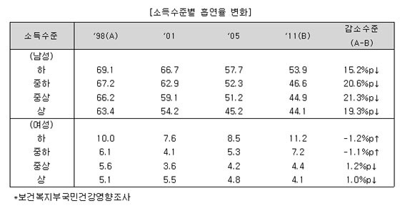 Áö³ 2006³â 10.¿ù 13ÀÏÀÚ Çì·²µå°æÁ¦ ¡®Çѳª¶ó´ç, ´ã¹î°ª ÀλóÃßÁø º¹ÁöºÎ ¹Ý¹Ú¡¯ ±â»ç¿¡¼ º¸°Çº¹ÁöºÎ ÀÚü Èí¿¬À²Á¶»ç¿¡ µû¸£¸é, 2009³â ³²¼ºÈí¿¬À²Àº 43.1%¿¡¼ 2011³â 39%·Î 4.1%³ª °¨¼ÒÇß´Ù. ¶Ç º¸°Çº¹ÁöºÎÀÇ ¡®±¹¹Î°Ç°¿µ¾çÁ¶»ç¡¯¿¡ µû¸£¸é, 2010³â ´ç½Ã 48.3%¿´´ø ³²¼ºÈí¿¬À²ÀÌ 2012³â¿¡ 43.7%·Î 4.6%p °¨¼ÒÇß´Ù.