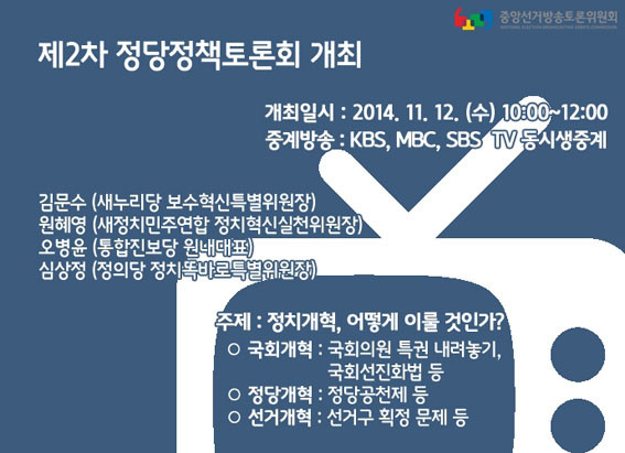 Áß¾Ó¼±°Å¹æ¼ÛÅä·ÐÀ§¿øÈ¸´Â À̹ø Åä·Ðȸ¿¡ °¢ Á¤´çÀÇ Á¤Ä¡°³ÇõÀ» ÃßÁøÇϰí ÀÖ´Â ÀλçµéÀÌ Á÷Á¢ Åä·ÐÀÚ·Î Âü¿©ÇÏ¿© Á¤Ä¡°³Çõ ¹æ¾È¿¡ ´ëÇØ ½ÉµµÀÖ´Â Åä·ÐÀ» ÁøÇàÇÒ ¿¹Á¤À̹ǷΠ±¹¹ÎµéÀÇ ¸¹Àº °ü½É°ú ½ÃûÀ» ±â´ëÇÑ´Ù°í ¹àÇû´Ù.