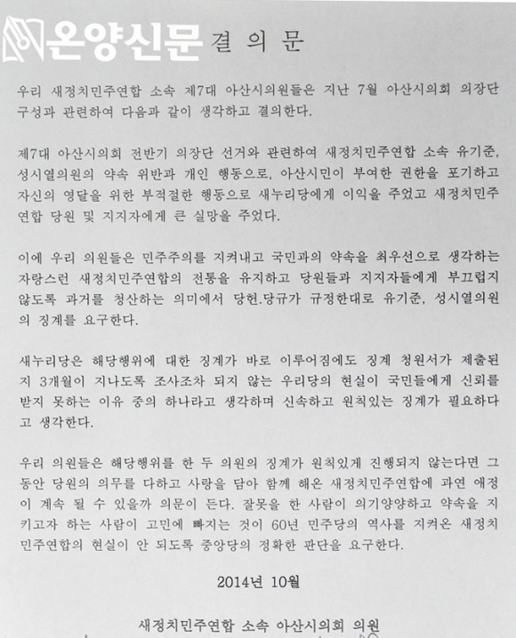 | | ¡è¡è Áö³ 10¿ù ÀÇÀå´Ü ¼±°Å¿¡¼ ´çÀÇ °áÁ¤À» ¹«·ÂÈ ½ÃŲ ÀÇ¿øµéÀÇ Â¡°è¸¦ ¿ä±¸ÇÑ °áÀǹ® ³»¿ë. | ¨Ï ¿Â¾ç½Å¹® | |