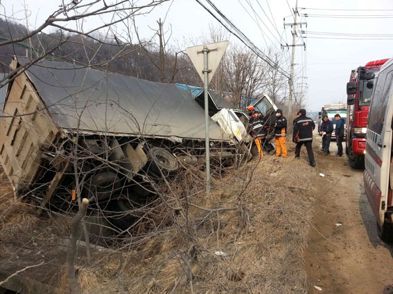 À̳¯ ±³Åë»ç°í Áö·ÉÀ» ¹Þ°í ¾Æ»ê¼Ò¹æ¼ 119±¸Á¶±¸±Þ¼¾ÅÍ(¼¾ÅÍÀå À̵¿¿ø) ±¸Á¶´ë¿ø 5¸íÀÌ »ç°íÇöÀå µµÂøÇßÀ» ´ç½Ã, ¿îÀüÀڴ ȹ°Â÷ ¿îÀü¼®¿¡ ³¢¾î ³ª¿ÀÁö ¸øÇÏ°í ±¸Á¶¸¦ ±â´Ù¸®°í ÀÖ´Â »óȲÀ̾ú´Ù.