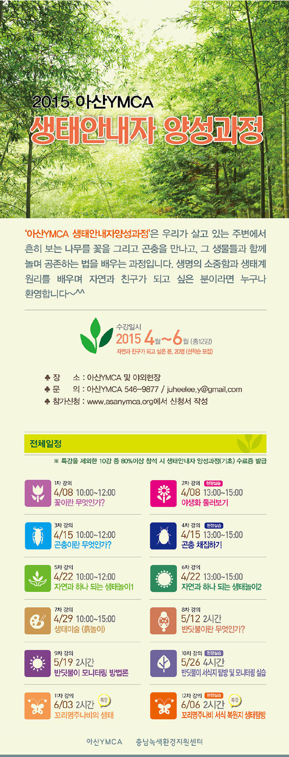 ¾Æ»êYMCA¿Í Ãæ³²³ì»öȯ°æÁö¿ø¼¾ÅͰ¡ °øµ¿ÁÖÃÖÇÏ´Â º» °úÁ¤ÀÇ Âü°¡½Åû(¼±Âø¼ø 20¸í)Àº ¾Æ»êYMCA ȨÆäÀÌÁö(www.asanymca.org)¿¡¼ °¡´ÉÇÏ¸ç ¹®ÀÇ´Â ¾Æ»êYMCA(546-9877)·Î ÇÏ¸é µÈ´Ù.