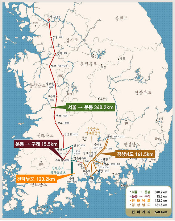 ÀÌ º¸°íȸ´Â Áö³ÇØ 5¿ù 20ÀϺÎÅÍ 1¿ù 20ÀϱîÁö ¾à 8°³¿ù°£¿¡ °ÉÃÄ ¼¿ïºÎÅÍ °æ±âµµ, ÃæÃ»³²µµ¸¦ °ÅÃÄ Àü¶óºÏµµ ¿îºÀ±îÁö ¾à 340.2km¿¡ ´ÞÇÏ´Â ¹Ì°íÁõµÈ À̼ø½Å ¹éÀÇÁ¾±º·Î °íÁõÀ» ¿Ï·áÇÑ °¡¿îµ¥ ±âÁ¸ÀÇ Àü¶ó³²µµ ±¸°£ 123.2km¿¡, °æ»ó³²µµ ±¸°£ 161.5km¿¡¸¦ Æ÷ÇÔÇÏ¿© ÃÑ 640.4km¿¡¿¡ ´ÞÇÏ´Â À̼ø½Å ¹éÀÇÁ¾±º·Î Àü ±¸°£ÀÌ ÃÖÃÊ·Î °íÁõÀÌ ¿Ï·áµÅ °ü·Ã ÁöÀÚü ´ã´çÀÚµé°ú ÇÑÀÚ¸®¿¡¼ Ȱ¿ë ¹æ¾ÈÀ» ã±â À§ÇÑ ÀÚ¸®¿´´Ù.