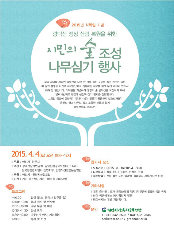 2015³â ½Ä¸ñÀÏ ±â³ä ±¤´ö»ê Á¤»ó º¹¿øÀ» À§ÇÑ ½Ã¹ÎÀÇ ½£ Á¶¼º ³ª¹«½É±â Çà»ç°¡ ¿À´Â 4¿ù 4ÀÏ ¿ÀÀü 10½ÃºÎÅÍ ±¤´ö»ê Á¤»ó ÁÖº¯¿¡¼ °³ÃֵȴÙ.