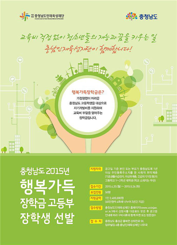 Ãæ³²ÀÎÀçÀ°¼ºÀç´Ü(ÀÌ»çÀå ¾ÈÈñÁ¤)Àº °¡Á¤ÇüÆíÀÌ ¾î·ÆÁö¸¸ ½º½º·Î ÀÚ½ÅÀÇ Àç´ÉÀ» °³¹ßÇϰíÀÚ ÇÏ´Â ÇлýµéÀ» À§ÇÑ ÀåÇбÝÀ¸·Î ¡®Çູ°¡µæÀåÇбݡ¯ ÀåÇлýÀ» ¸ðÁýÇÑ´Ù°í ¹àÇû´Ù.