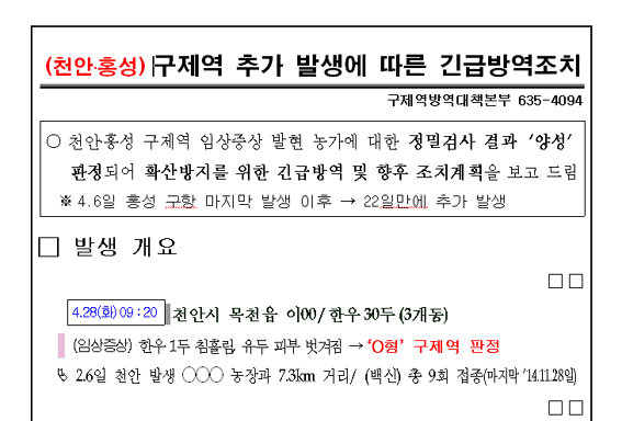 °°Àº ³¯ ¿ÀÈÄ 4½Ã30ºÐ È«¼º±º Àå°î¸é Àå00 ³ó°¡ÀÇ µÅÁö³óÀå(1õ200µÎ¡¤3°³µ¿)¿¡¼µµ ºñÀ°µ· ÆÄÇà(20µÎ), ¼öÆ÷(2µÎ) µîÀÇ ÀÓ»óÁõ»óÀÌ ¹ß°ßµÆ°í °á±¸Àº ¡®OÇü¡¯ ±¸Á¦¿ª ÆÇÁ¤À» ¹Þ¾Ò´Ù. ÀÌ ³óÀåÀº 3¿ù 16ÀÏ È«¼º ¹ß»ý ³óÀå°ú 2.9km °Å¸®¸¦ µÎ°í ÀÖ¾úÀ¸¸ç Áö³ 4¿ù 16ÀÏ ¹è½ÅÀ» Á¢Á¾Çß´ø ³óÀåÀ¸·Î ¾Ë·ÁÁ³´Ù.