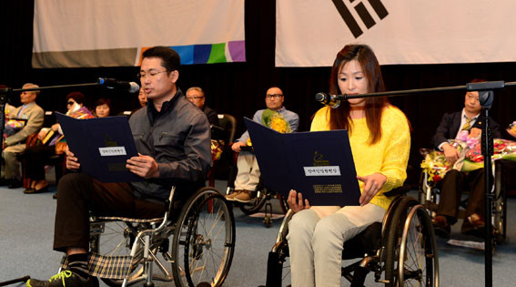 Àå¾ÖÀο¡ ´ëÇÑ ÀÎ½Ä °³¼±À» À§ÇØ Áö³ 2003³â Á¦Á¤ÇÑ Àå¾ÖÀλóÀº Àå¾Ö¸¦ µó°í µµ¹Î¿¡°Ô ¸ð¹üÀÌ µÇ°í ÀÖ´Â Àå¾ÖÀÎÀ» ½Ã¡¤±ºº°·Î 1¸í¾¿ ¹ß±¼ÇØ Ç¥Ã¢ÇÏ´Â Á¦µµ´Ù.