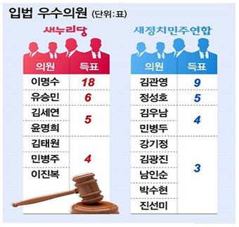 À̹ø Á¶»ç´Â ¸Ó´ÏÅõµ¥ÀÌ ¡®´õ300(the300)¡¯ÀÌ Ã¢¸³ 1³âÀ» ¸Â¾Æ ±¹È¸ÀÇ¿øµéÀ» ´ë»óÀ¸·Î ¡®µ¿·áÀÇ¿øµé °¡¿îµ¥ ÀÔ¹ýȰµ¿À» °¡Àå ÀßÇÑ ÀÇ¿ø¡¯À» ¿©¾ßº°·Î 1¸í¾¿ ²Å¾Æ ´Þ¶ó´Â ¼³¹® °á°ú·Î, ¿©´ç¿¡¼´Â »õ´©¸®´çÀÇ À̸í¼ö ÀÇ¿øÀÌ 18Ç¥, ¾ß´ç¿¡¼´Â ±è°ü¿µ ÀÇ¿øÀÌ 9Ç¥¸¦ ¾ò¾î °¢°¢ 1À§¿¡ ¼±Á¤µÆ´Ù.