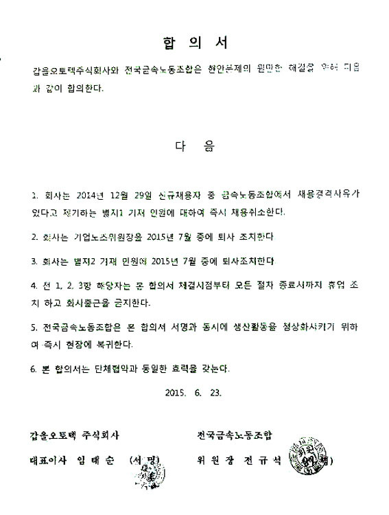 °©À»¿ÀÅäÅØ »çÃø°ú ±Ý¼Ó³ëÁ¶ °©À»¿ÀÅ䳨 Áöȸ´Â ¡°È¸»ç´Â 2014³â 12¿ù 29ÀÏ ½Å±Ô ä¿ëÀÚ Áß ±Ý¼Ó³ëµ¿Á¶ÇÕ¿¡¼ ä¿ë °á°Ý»çÀ¯°¡ ÀÖ´Ù°í Á¦±âÇÏ´Â º°Áö1(ƯÁ¤ Àι°) ±âÀç Àοø¿¡ ´ëÇØ Áï½Ã ä¿ë Ãë¼ÒÇÑ´Ù¡± µî 6°³Ç×ÀÇ ³»¿ëÀ» ´ãÀº ÇÕÀǹ®¿¡ ¼¸íÇß´Ù.