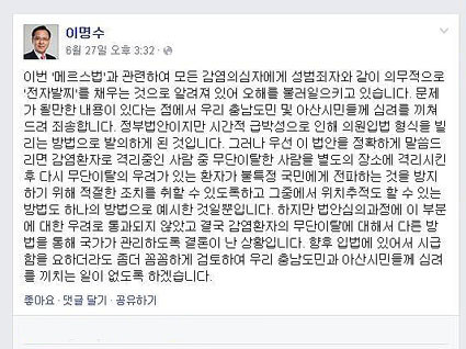 | | ¨Ï ¿Â¾ç½Å¹® | ÇÑÆí ÀÌ¿¡ ´ëÇØ À̸í¼ö ÀÇ¿øÀº 27ÀÏ ¿ÀÈÄ ÀÚ½ÅÀÇ SMS(ÆäÀ̽ººÏ)¸¦ ÅëÇØ ¡°À̹ø ¡®¸Þ¸£½º¹ý¡¯°ú °ü·ÃÇÏ¿© ¸ðµç °¨¿°ÀǽÉÀÚ¿¡°Ô ¼º¹üÁËÀÚ¿Í °°ÀÌ Àǹ«ÀûÀ¸·Î ¡®ÀüÀÚ¹ßÂ¸¦ ä¿ì´Â °ÍÀ¸·Î ¾Ë·ÁÁ® ÀÖ¾î ¿ÀÇØ¸¦ ºÒ·¯ÀÏÀ¸Å°°í ÀÖ´Ù. ¹®Á¦°¡ µÉ¸¸ÇÑ ³»¿ëÀÌ ÀÖ´Ù´Â Á¡¿¡¼ ¿ì¸® Ãæ³²µµ¹Î ¹× ¾Æ»ê½Ã¹Îµé²² ½É·Á¸¦ ³¢Ãĵå·Á Á˼ÛÇÏ´Ù¡±°í »ç°úÇϰí, ¡°Á¤ºÎ¹ý¾ÈÀÌÁö¸¸ ½Ã°£Àû ±Þ¹Ú¼ºÀ¸·Î ÀÎÇØ ÀÇ¿øÀÔ¹ý Çü½ÄÀ» ºô¸®´Â ¹æ¹ýÀ¸·Î ¹ßÀÇÇÏ°Ô µÈ °ÍÀÌ´Ù. ±×·¯³ª ¿ì¼± ÀÌ ¹ý¾ÈÀ» Á¤È®ÇÏ°Ô ¸»¾¸µå¸®¸é °¨¿°È¯ÀÚ·Î °Ý¸®ÁßÀÎ »ç¶÷ Áß ¹«´ÜÀÌÅ»ÇÑ »ç¶÷À» º°µµÀÇ Àå¼Ò¿¡ °Ý¸®½ÃŲ ÈÄ ´Ù½Ã ¹«´ÜÀÌÅ»ÀÇ ¿ì·Á°¡ Àִ ȯÀÚ°¡ ºÒƯÁ¤ ±¹¹Î¿¡°Ô ÀüÆÄÇÏ´Â °ÍÀ» ¹æÁöÇϱâ À§ÇØ ÀûÀýÇÑ Á¶Ä¡¸¦ ÃëÇÒ ¼ö ÀÖµµ·Ï ÇÏ°í ±×Áß¿¡¼ À§Ä¡ÃßÀûµµ ÇÒ ¼ö ÀÖ´Â ¹æ¹ýµµ ÇϳªÀÇ ¹æ¹ýÀ¸·Î ¿¹½ÃÇÑ °ÍÀÏ »Ó¡¯À̶ó°í ¼³¸íÇß´Ù.