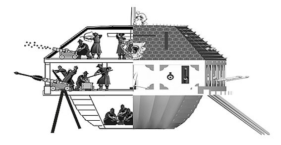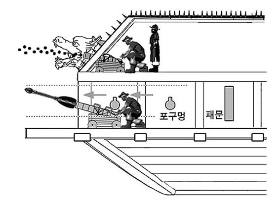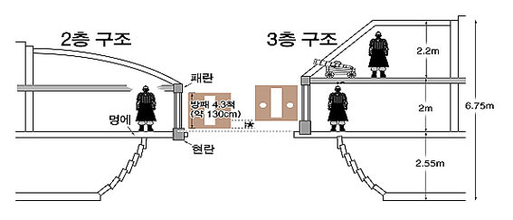 ³·Àº ÆÐ¶õÀÇ À§Ä¡´Â 2Ãþ ±¸Á¶ ¶Ç´Â ¸ðÈ£ÇÑ ³ôÀÌÀÇ ºÎºÐ°©ÆÇ 3Ãþ ±¸Á¶ÀÇ °ÅºÏ¼±À¸·Î Á¦ÇѵǴµ¥ ºÎºÐ°©ÆÇ 3Ãþ ±¸Á¶¿¡¼µµ ¾Æ·¡ÀÇ ±×¸²°ú °°ÀÌ °³ÆÇÀÇ Æ÷±¸¸ÛÀº ÈÆ÷ÀÇ À§Ä¡¿Í °Å¸®°¡ ÀÖ¾î 3Ãþ¿¡¼ ÈÆ÷¸¦ »ç¿ëÇÒ ¼ö ¾ø´Â ±¸Á¶°¡ µÈ´Ù. µû¶ó¼ ÀÓÁø¿Ö¶õ, 1795³â °ÅºÏ¼±Àº 2Ãþ°ú 3ÃþÀÇ °©ÆÇ Å©±â°¡ °°Àº ¿ÏÀüÇÑ 3Ãþ ±¸Á¶ÀÇ °ÅºÏ¼±À̶ó´Â °á·Ð¿¡ µµ´ÞÇÏ°Ô µÈ´Ù.