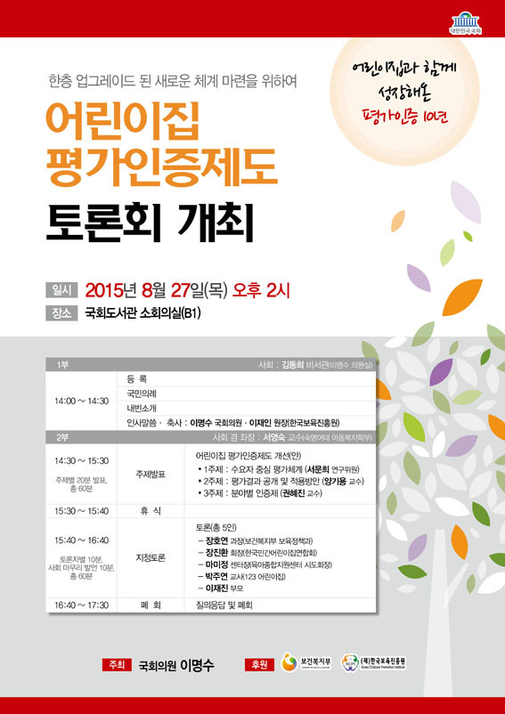 ±¹È¸ º¸°Çº¹ÁöÀ§¿øÈ¸ »õ´©¸®´ç °£»çÀÎ À̸í¼ö ÀÇ¿øÀÌ ¿À´Â 8¿ù 27ÀÏ ¿ÀÈÄ 2½Ã ±¹È¸µµ¼°ü ¼ÒȸÀǽǿ¡¼ ¡®¾î¸°ÀÌÁýÆò°¡ÀÎÁõÁ¦µµ °³Æí¡¯À̶ó´Â ÁÖÁ¦·Î Åä·Ðȸ¸¦ °³ÃÖÇÑ´Ù.