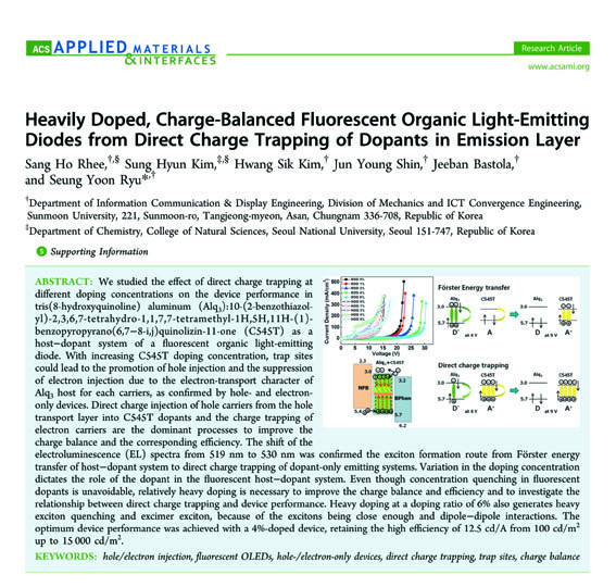 ³í¹® Á¦¸ñÀº ¡°°úµµÇεÈ, ij¸®¾î ±ÕÇüÀâÈù ÀüÇÏ Á÷Á¢ÁÖÀÔÈ¿°ú¿¡ ÀÇÇÑ Çü±¤ À¯±âÀü°è¹ß±¤¼ÒÀÚ¿¡¼ÀÇ ¿¬±¸¡±(Heavily Doped, Charge-Balanced Fluorescent Organic Light-Emitting Diodes from Direct Charge Trapping of Dopants in Emission Layer)ÀÌ´Ù.