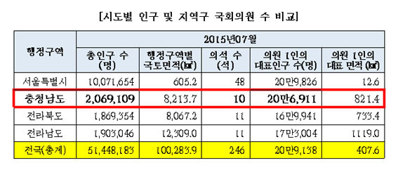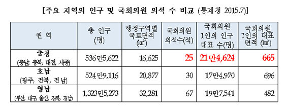 ¿µ³²±Ç°ú ºñ±³ÇÏ´õ¶óµµ ÃæÃ»±ÇÀº ±¹È¸ÀÇ¿ø 1ÀÎ´ç ´ëÇ¥ÇÏ´Â Àα¸¼ö°¡ 21¸¸ 4õ624¸íÀ̳ª, ¿µ³²±ÇÀÇ 19¸¸ 7õ541¸íÀ¸·Î ÃæÃ»±ÇÀÌ 1¸¸ 7õ83¸íÀÌ ¸¹´Ù°í ÁöÀûÇß´Ù.