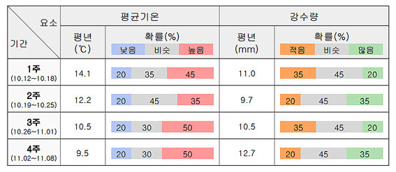 ÇÑÆí ¿ÃÇØ ÇÑ·Î(8ÀÏ) ¹× ÃߺÐ(24ÀÏ)ÀÇ ±â»óÀü¸ÁÀ» º¸¸é Çѷΰ¡ µé¾îÀÖ´Â 10¿ù µÑ° ÁÖ(5ÀÏ~11ÀÏ)¿¡´Â À̵¿¼º °í±â¾Ð°ú »óÃþ ÇѱâÀÇ ¿µÇâÀ¸·Î ±â¿Â º¯È°¡ Å©°ÚÀ¸¸ç, ±â¿ÂÀº Æò³â°ú ºñ½ÁÇϰųª ³·°Ú°í, °¼ö·®Àº Æò³â°ú ºñ½ÁÇϰųª ÀûÀ» °ÍÀ¸·Î Àü¸ÁµÈ´Ù.