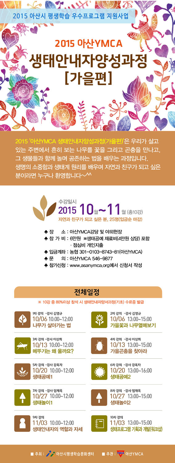 ¾Æ»ê½ÃÆò»ýÇнÀ¹®È¼¾ÅͰ¡ ÁÖÃÖÇϰí, ¾Æ»êYMCA°¡ ÁÖ°üÇÏ´Â º» °úÁ¤ÀÇ Âü°¡½Åû(¼±Âø¼ø 25¸í)Àº ¾Æ»êYMCA ȨÆäÀÌÁö(www.asanymca.org)¿¡¼ °¡´ÉÇÏ¸ç ¹®ÀÇ´Â ¾Æ»êYMCA(546-9877)·Î ÇÏ¸é µÈ´Ù.