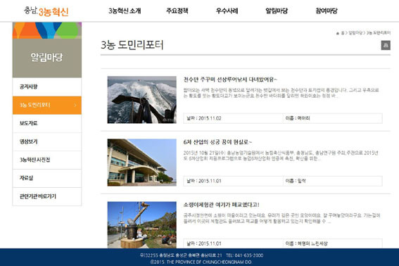 | | ¨Ï ¿Â¾ç½Å¹® | | Ãæ³²µµ°¡ ¼ÒÅë°ú °øÀ¯, Âü¿©ÇüÀ¸·Î 3³óÇõ½Å ȨÆäÀÌÁö(http://www.chungnam.net/3nongMain.do) °³ÆíÀÛ¾÷À» ÃÖ±Ù ¸¶¹«¸®Çϰí, ¼ºñ½º¸¦ º»°Ý ½ÃÀÛÇß´Ù.