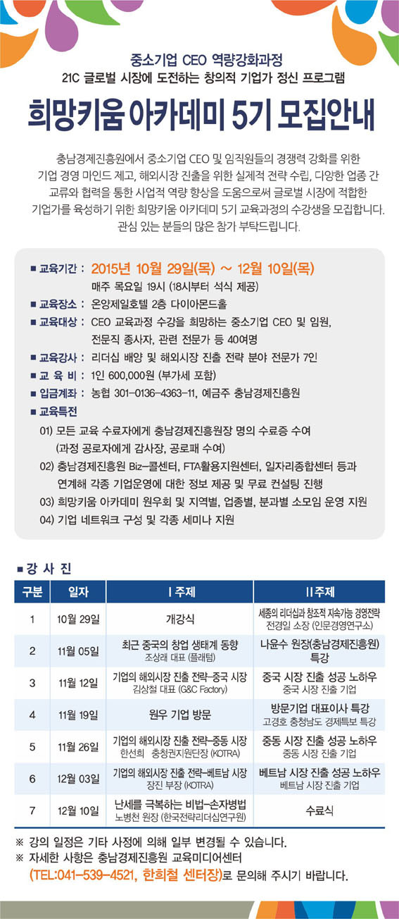Ãæ³²°æÁ¦ÁøÈï¿ø(¿øÀå ³ªÀ±¼ö)Àº Áß¼Ò±â¾÷ CEO ¹× ÀÓÁ÷¿øµéÀÇ °æÀï·Â °È¿Í ´Ù¾çÇÑ ¾÷Á¾°£ ±³·ù¿Í Çù·ÂÀ» ÃËÁøÇϱâ À§ÇÑ ¡®Èñ¸ÁŰ¿ò ¾ÆÄ«µ¥¹Ì 5±â¡¯¸¦ ¸ðÁýÇÑ´Ù.