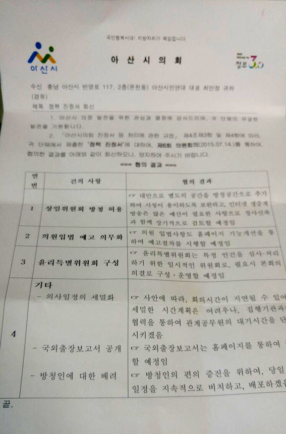 ¾Æ»ê½Ã¹Î¿¬´ë(´ëÇ¥ ÃÖ¸¸Á¤)´Â 7´ë ¾Æ»ê½ÃÀÇȸ 1³âÀ» ¸ÂÀÌÇØ, Áö³ 7¿ù 2ÀÏ ¾Æ»ê½ÃÀÇȸ¿¡ ½Ã¹ÎµéÀÇ ÀǰßÀ» ¸ð¾Æ Á¤Ã¥ÁøÁ¤¼¸¦ Á¦ÃâÇßÀ¸¸ç ¾Æ»ê½ÃÀÇȸ´Â 7¿ù 14ÀÏ ÀÇ¿øÈ¸ÀǸ¦ ÅëÇØ Á¤Ã¥ÁøÁ¤¼¿¡ ´ëÇØ ÇùÀÇÇÏ°í ±× °á°ú¸¦ Å뺸Çß´Ù°í ¹àÇû´Ù.