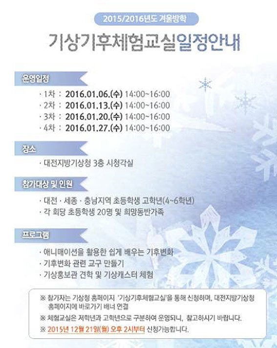 ´ëÀüÁö¹æ±â»óû(ûÀå ÀÓ¿ëÇÑ)Àº °Ü¿ï¹æÇбⰣ¿¡ ´Ù¾çÇÑ °æÇèÀ» ÇÏ°í ½Í¾îÇÏ´Â ÃʵîÇлýµéÀÌ ¸¹¾ÆÁü¿¡ µû¶ó üÇèÇü ±â»ó±âÈİúÇÐ ±³À° ÇÁ·Î±×·¥ÀÎ ¡®2015/2016³âµµ °Ü¿ï¹æÇÐ ±â»ó±âÈÄ Ã¼Çè±³½Ç¡¯À» ¿î¿µÇÑ´Ù°í ¹àÇû´Ù.