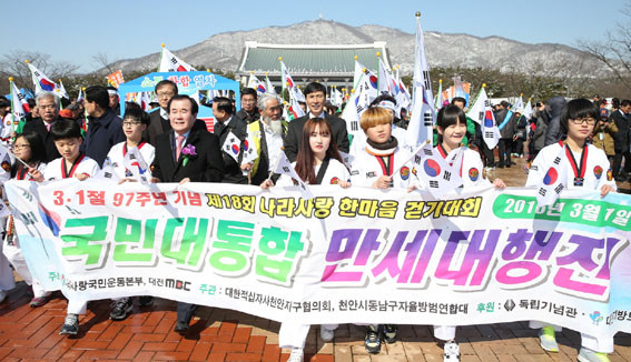 ÇÑÆí, À̳¯ 3¡¤1Àý Çà»ç´Â ¾È Áö»ç¿Í »ýÁ¸ ¾Ö±¹Áö»ç, µ¶¸³À¯°øÀÚ, ½ÃÀ塤±º¼ö, ±¤º¹È¸ µî º¸ÈÆ °ü·Ã ´Üü ȸ¿ø, µµÃ» Á÷¿ø µî 700¿© ¸íÀÌ Âü¼®ÇÑ °¡¿îµ¥ µ¶¸³¼±¾ð¼ ³¶µ¶, 3¡¤1Àý À¯°øÀÚ Ç¥Ã¢, ±â³ä»ç µîÀÇ ¼øÀ¸·Î ÁøÇàµÆ´Ù.