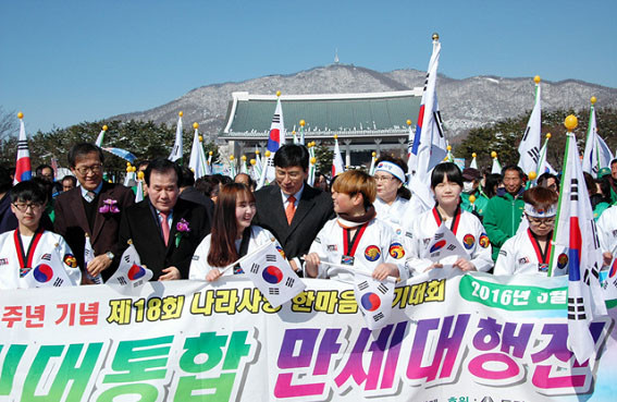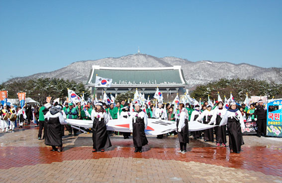 ÀÌ¾î ±¹¹Î´ëÅëÇÕÀº ±¹¹ÎÇູ½Ã´ë·Î °¡´Â Áö¸§±æÀ̶ó´Â ½½·Î°Ç¾Æ·¡ ÆîÃÄÁø ³ª¶ó»ç¶ûÇѸ¶À½ °È±â´ëȸ(±¹¹Î´ëÅëÇÕ ¸¸¼¼´ëÇàÁø)´Â ´ëÇüűرâ¿Í ¼ÒÅë°ú ÈÇÕÀÇ ¹Ø°Å¸§ÀÌ µÉ °ÍÀ» ´ÙÁüÇÏ´Â 25m±æÀÌÀÇ ±¹¹Î´ëÅëÇÕ¸ðÇü ¿Â÷ÆÛÆ÷¸Õ½º, ¡®ÀϺ»Àº µ¶µµµ¿¿µ»ó »ó¿µÀ» Áï°¢ Áß´ÜÇÏ¶ó¡¯ ¡®¿ì¸®°¡ ÁöŰ°í »ç¶ûÇØ¾ß ÇÒ ´ëÇѹα¹¡¯ µîÀÇ ±¸È£°¡ »õ°ÜÁø 20¿©°³ÀÇ ¸¸Àå±â¸¦ ¾Õ ¼¼¿î °¢ ±â°ü¡¤´Üü¿Í Á¾±³´Üü ½Ã¹ÎµéÀÌ Å±رâ¿Í ¹«±ÃȲÉÀÌ ±×·ÁÁø ÃѱæÀÌ 300mÀÇ ´ëÇü Çö¼ö¸·°ú űر⸦ ¼Õ¿¡ ¼Õ¿¡ µé°í űر⠹°°áÀ» ÀÌ·ç¸ç ¸¸¼¼ÀçÇö°ú ÇÔ²² ¸¸¼¼ÇÔ¼ºÀ» ÈûÂ÷°Ô ¿ÜÄ¡¸ç µ¶¸³±â³ä°ü °Ü·¹ÀÇÅ«¸¶´ç¿¡¼ ¸ñõ ³ªµé¸ñÀ» ¿Õº¹ÇÏ´Â ÃÑ 4.3km±¸°£¿¡¼ ¼±¿µéÀÇ ³ª¶ó»ç¶ûÁ¤½ÅÀ» µÇ»õ±â°í Èñ¸ÁÂù ÀÇÁö¸¦ ´ÙÁ³´Ù.