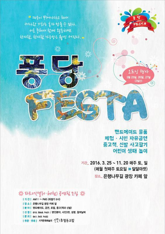 »ç¶÷°ú »çȸ¸¦ ÀÕ´Â »çȸÀû°æÁ¦¸¦ ÁöÇâÇÏ´Â Áö¿ª¹®È¿¹¼úÀ§ »êõ;BÇùµ¿Á¶ÇÕÀº ¿À´Â 3¿ù 25ÀϺÎÅÍ ¸ÅÁÖ Åä, ÀÏÀÏ¿äÀÏ ÀºÇ೪¹«±æ¿¡¼ ¡®Æþ´ç FESTA¡¯¸¦ ÁøÇàÇÑ´Ù.