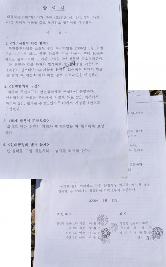 À̸¦ °è±â·Î ´ç½Ã ÁÖº¯ ¸¶À» ÁֹεéÀº ¾ðÁ¦ À̰°Àº ´ëÇü »ç°í°¡ ÅÍÁúÁö ¸ð¸£´Â ºÒ¾È°¨¿¡ ´ëÃ¥À§¸¦ ±¸¼ºÇÏ¿© Áýȸ µîÀ» ÅëÇÏ¿© 2006³â 3¿ù 31ÀÏ ´ë·úÁ¦°ü°ú ¡®ºÎÅºÃæÀü»ç¾÷Àº ¼Ò½ÇµÈ °øÀå º¹±¸±âÇÑÀ» 2006³â 5¿ù 31ÀϺÎÅÍ 1³âÀ¸·Î Çϰí, º¹±¸ ¿Ï·áÈÄ Á¤»ó °¡µ¿½ÃºÎÅÍ 10³âÈÄ °¡½º½Ã¼³ ÀÌÀüÀ» ¿øÄ¢À¸·Î ÇÑ´Ù¡¯´Â ÇÕÀǼ¸¦ ÀÛ¼ºÇÏ¿© °øÁõ±îÁöÇÏ°í ´ç½Ã Áֹεé°úÀÇ ¸¶ÂûÀ» Àϴܶô Áö¾ú´Ù.