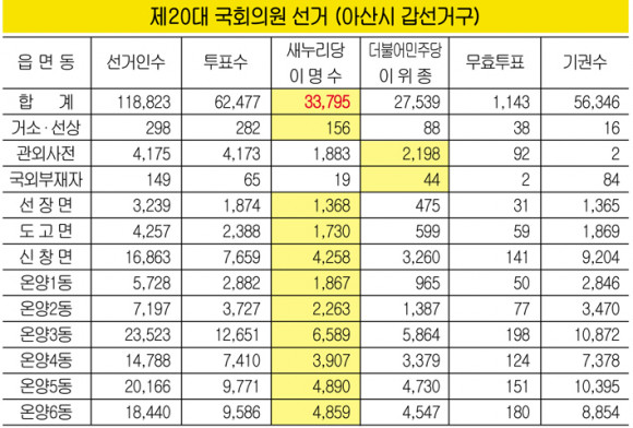 À̹ø Á¦20´ë ±¹È¸ÀÇ¿ø¼±°Å¿¡¼ ¾Æ»ê½Ã´Â ÃѼ±°ÅÀμö 23¸¸ 1õ747¸í(¼±°ÅÀÏÅõÇ¥ÀÚ ¹× »çÀüÅõÇ¥ µî Æ÷ÇÔ) Áß ¼±°ÅÀÏÅõÇ¥¿¡ 12¸¸ 3õ136¸í, »çÀüÅõÇ¥ µîÀ¸·Î 2¸¸ 3õ703¸íÀÌ Âü¿©ÇØ 53.1%ÀÇ ÅõÇ¥À²À» º¸¿´´Ù. ÀÌ´Â Ãæ³²µµ Æò±Õ ÅõÇ¥À²ÀÎ 55.5%º¸´Ù ³·¾ÒÀ¸¸ç ƯÈ÷ Ãæ³²µµ³»¿¡¼ õ¾È µ¿³²±¸¿¡ ÀÌ¾î µÎ¹øÂ°·Î ³·Àº ÅõÇ¥À²À» º¸¿´´Ù.