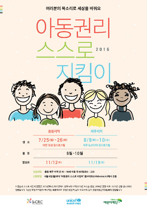 ÃæÃ» ¹× Á¦ÁÖ Áö¿ª¿¡ °ÅÁÖÇÏ´Â ¸¸ 10-18¼¼(ÃÊ 5 - °í 3) ¾Æµ¿ ´©±¸³ª Âü¿© °¡´ÉÇϸç, 6¿ù 6ÀÏ(¿ù)±îÁö ¡®¾Æµ¿±Ç¸® ½º½º·Î ÁöÅ´ÀÌ¡¯ À¥»çÀÌÆ®(http://childvoice.kr)¿¡ ½ÅûÇÏ¸é µÈ´Ù. ½Åû ¾Æµ¿ Áß °¢ Áö¿ªº° ¾Æµ¿ 80¸íÀÌ ÃÖÁ¾ ¼±Á¤µÈ´Ù.