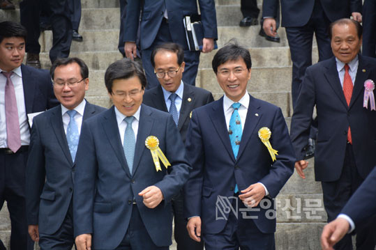 | | ¡è¡è ¡ã´Ù·Ê¿¡ ¾Õ¼ À̸í¼ö ÀÇ¿ø(µÚ ¿À¸¥ÂÊ)ÀÌ È²±³¾È ÃѸ®¿¡°Ô °ÈÆ½Ä ´ç¼±ÀÎ(¿ÞÂÊ)À» ¼Ò°³Çϰí ÀÖ´Ù. °¡¿îµ¥´Â ³ª¼±È ¹®ÈÀçûÀå. | ¨Ï ¿Â¾ç½Å¹® | |