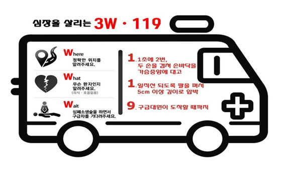 ÀÌ¿¡ ¾Æ»ê¼Ò¹æ¼´Â ½Ã¹Îµé ´ë»óÀ¸·Î¡®3W-119¡¯¿¡ ´ëÇØ Àû±Ø È«º¸ Ȱµ¿À» ÆîÄ¡°í Àִµ¥, ¡®3W-119¡¯¿¡¼¡®3W¡¯¶õ ¡®Where=ȯÀÚ ¹ß»ý À§Ä¡¸¦ Á¤È®ÇϰÔ, What=ȯÀÚ»óŰ¡ ¾î¶²Áö Ä§ÂøÇϰÔ, Wait=½ÉÆó¼Ò»ý¼úÀ» ÇÏ¸é¼ ±¸±ÞÂ÷¸¦ ±â´Ù·Á ÁÖ¼¼¿ä¡¯ÀÇ ¾àÀÚ·Î ½ÉÁ¤Áö ȯÀÚ°¡ ¹ß»ýÇßÀ» ¶§ÀÇ 119½Å°í¿ä·ÉÀÌ´Ù.