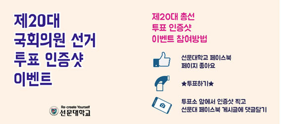 ÀÌ´Â ¼±¹®´ë SNS(https://www.facebook.com/sunmoonuniversity)¸¦ ÅëÇØ Âü¿©ÇÒ ¼ö ÀÖµµ·Ï Çϰí Àִµ¥, À̺¥Æ® ±â°£Àº 4¿ù 8ÀϺÎÅÍ ÅõÇ¥Á¾·áÀÏ ´ÙÀ½³¯ÀÎ 14ÀϱîÁöÀ̸ç, ÆäÀ̽ººÏ °Ô½Ã±Û¿¡ ÀÎÁõ¼¦ ´ñ±Û´Þ±â·Î Âü¿©ÇÏ¸é µÈ´Ù.