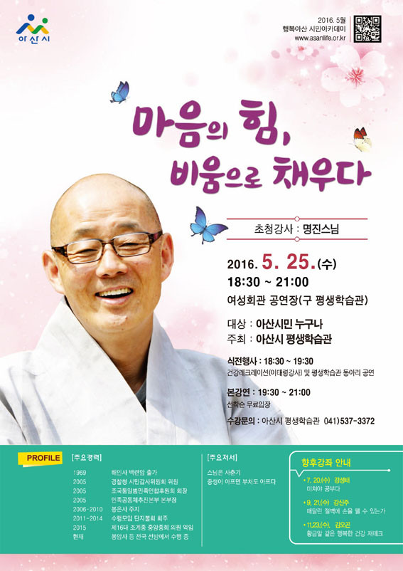¾Æ»ê½Ã Æò»ýÇнÀ¹®È¼¾ÅÍ(¼ÒÀå ¹ÎÁ¤ÀÏ)¿¡¼´Â ¿À´Â 5¿ù 25ÀÏ ¿ÀÈÄ 7½Ã30ºÐ ¿©¼ºÈ¸°ü °ø¿¬Àå¿¡¼ Àü ºÀÀº»ç ÁÖÁöÀÎ ¸íÁø ½º´ÔÀ» ÃÊÃ»ÇØ ¡®¸¶À½ÀÇ Èû, ºñ¿òÀ¸·Î ä¿ì´Ù¡¯¶ó´Â ÁÖÁ¦·Î ½Ã¹Î¾ÆÄ«µ¥¹Ì¸¦ °³ÃÖÇÑ´Ù.