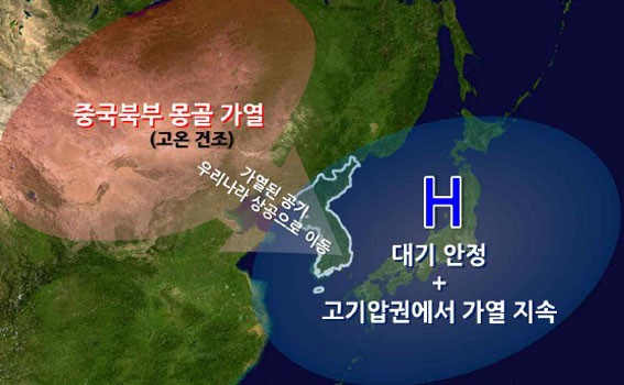 ´ëÀüÁö¹æ±â»óûÀº ÀÌ¿Í °°Àº °í¿ÂÀÇ ¿øÀÎÀ¸·Î Áß±¹ ºÏºÎ¿Í ¸ù°ñ¿¡¼ °¡¿µÈ °ø±â°¡ ¿ì¸®³ª¶ó »ó°øÀ¸·Î À¯ÀԵǰí, ¿ì¸®³ª¶ó ºÎ±ÙÀ¸·Î °í¾Ð´ë°¡ Á¤Ã¼Çϰí ÀÖ¾î °í¿Â¡¤°ÇÁ¶ÇÑ ³¯¾¾°¡ À̾îÁö°í ÀÖ´Ù°í ¹àÇû´Ù.