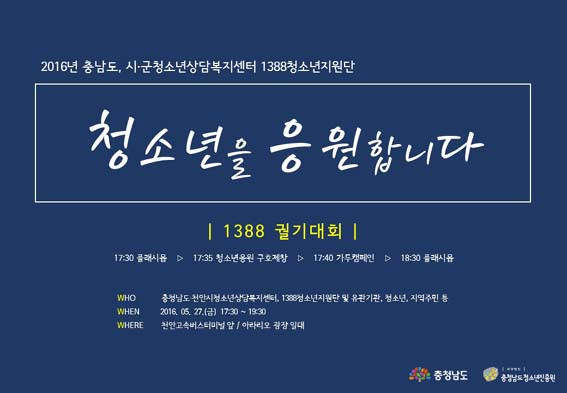 (Àç)ÃæÃ»³²µµÃ»¼Ò³âÁøÈï¿ø(¿øÀå Àå±â¼ö)Àº 5¿ù 27ÀÏ, û¼Ò³âÀÇ ´ÞÀ» ¸ÂÀÌÇØ Ãæ³²µµ³» 15°³ ½Ã¡¤±ºÃ»¼Ò³â»ó´ãº¹Áö¼¾ÅÍ¿Í °øµ¿À¸·Î ¡®Ã»¼Ò³âÀ» ÀÀ¿øÇÕ´Ï´Ù!¡¯¶ó´Â ½½·Î°ÇÀ¸·Î ¡®1388û¼Ò³âÁö¿ø´Ü 1388±È±â´ëȸ(ÀÌÇÏ 1388±È±â´ëȸ)¡¯¸¦ ½Ç½ÃÇÑ´Ù.