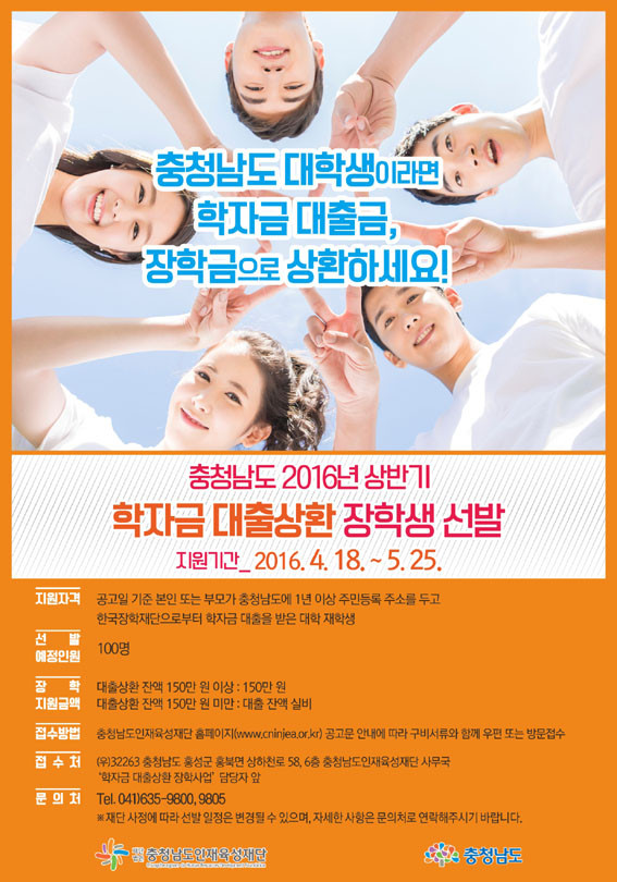 Ãæ³²ÀÎÀçÀ°¼ºÀç´Ü(ÀÌ»çÀå ¾ÈÈñÁ¤)Àº Ãæ³² ´ëÇлýµéÀÇ ÇÐÀÚ±Ý ´ëÃâ ¿ø±Ý ÀϺθ¦ Á÷Á¢ »óÈ¯ÇØÁÖ´Â ¡®»ó¹Ý±â ÇÐÀÚ±Ý ´ëÃâ»óȯ ÀåÇлý¡¯À» 5¿ù 25ÀϱîÁö ¸ðÁýÇÑ´Ù.