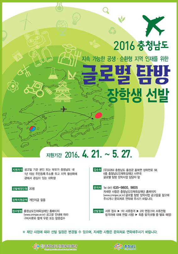 ÃæÃ»³²µµÀÎÀçÀ°¼ºÀç´Ü(ÀÌ»çÀå ¾ÈÈñÁ¤)Àº Áö¿ª Ȱ¼ºÈ¸¦ À§ÇÑ ÇØ¿Ü»ç·Ê¸¦ üÇèÇϰí Áö¼Ó °¡´ÉÇÑ °ø»ý?¼øÈ¯Çü ÀÎÀç·Î¼ Ãæ³² °øµ¿Ã¼ÀÇ ¹Ì·¡¿¡ ´ëÇØ °í¹ÎÇØº¸´Â ¡®±Û·Î¹ú ޹æ ÀåÇлý¡¯À» 5¿ù 27ÀϱîÁö ¸ðÁýÇÑ´Ù.