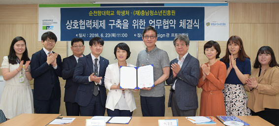 ¼øÃµÇâ´ëÇб³(ÃÑÀå ¼±³ÀÏ)´Â 6¿ù 23ÀÏ ¿ÀÀü ±³³» I¡¯Design°ü¿¡¼ (Àç)ÃæÃ»³²µµÃ»¼Ò³âÁøÈï¿ø°ú ÀçÇлýµéÀÇ ¾ÈÁ¤ÀûÀÎ ´ëÇлýȰ Áö¿øÀ» À§ÇÑ ¾÷¹«Çù¾àÀ» ü°áÇß´Ù°í ¹àÇû´Ù.