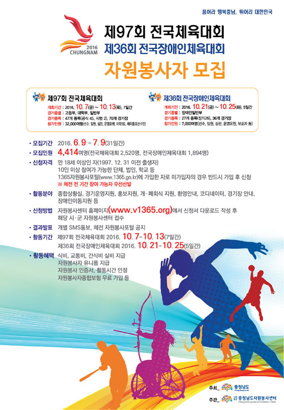 Ãæ³²µµ°¡ Á¦97ȸ Àü±¹Ã¼À°´ëȸ¿Í Á¦36ȸ Àü±¹Àå¾ÖÀÎüÀ°´ëȸ¿¡¼ Ȱµ¿ÇÒ ÀÚ¿øºÀ»çÀÚ 4õ414¸íÀ» ´ÙÀ½´Þ 9ÀϱîÁö ¸ðÁýÇÑ´Ù.