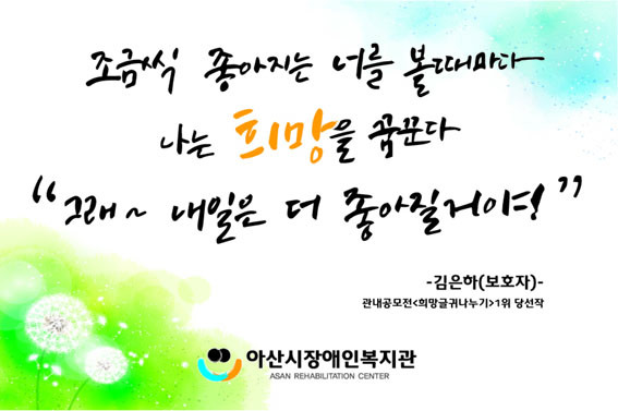 ¾ÕÀ¸·Î ¾Æ»ê½ÃÀå¾ÖÀκ¹Áö°ü¿¡¼´Â ºÐ±âº°·Î °ü³»°ø¸ðÀü ¡®Èñ¸Á±Û±Í³ª´©±â¡¯¸¦ ÁøÇàÇÒ ¿¹Á¤À̸ç, ´Ù¾çÇÑ ÁÖÁ¦¿¡ ´ëÇÑ Èñ¸Á ¸Þ½ÃÁö¸¦ °ø¸ðÇÒ °èȹÀÌ´Ù.