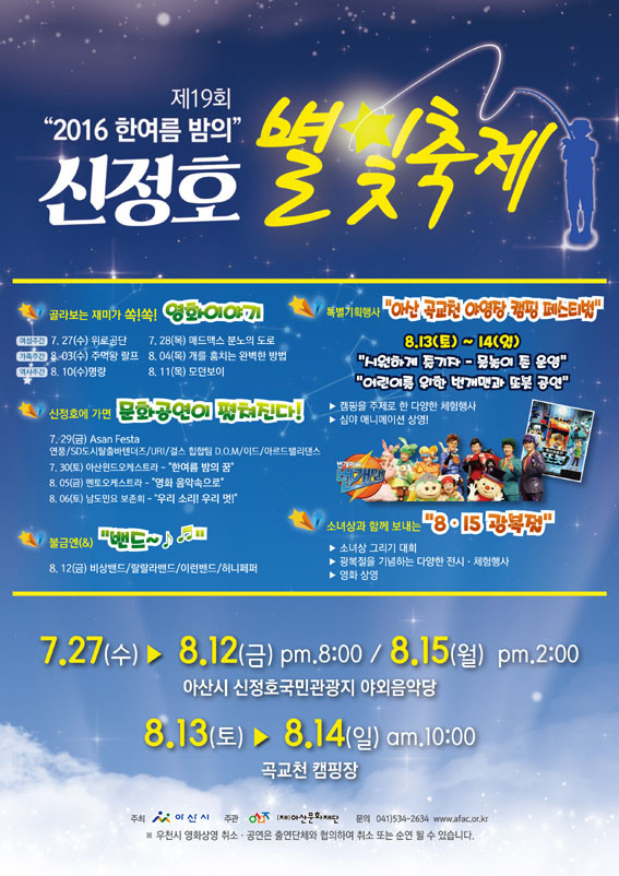 ¾Æ»ê½Ã´Â ¹«´õ¿î ¿©¸§¹ã ½Ã¹Îµé¿¡°Ô ¿µÈ¿Í ¹®È°ø¿¬À» Á¦°øÇÏ´Â ¡®2016 ÇÑ¿©¸§ ¹ãÀÇ ½ÅÁ¤È£ º°ºûÃàÁ¦¡¯¸¦ (Àç)¾Æ»ê¹®ÈÀç´Ü ÁÖ°üÀ¸·Î ¿À´Â 7¿ù 27ÀϺÎÅÍ 8¿ù 15ÀϱîÁö ÃÑ 14Àϰ£ ½ÅÁ¤È£ ¾ß¿ÜÀ½¾Ç´ç°ú °î±³Ãµ ¾ß¿µÀå¿¡¼ °³ÃÖÇÑ´Ù°í ¹àÇû´Ù.