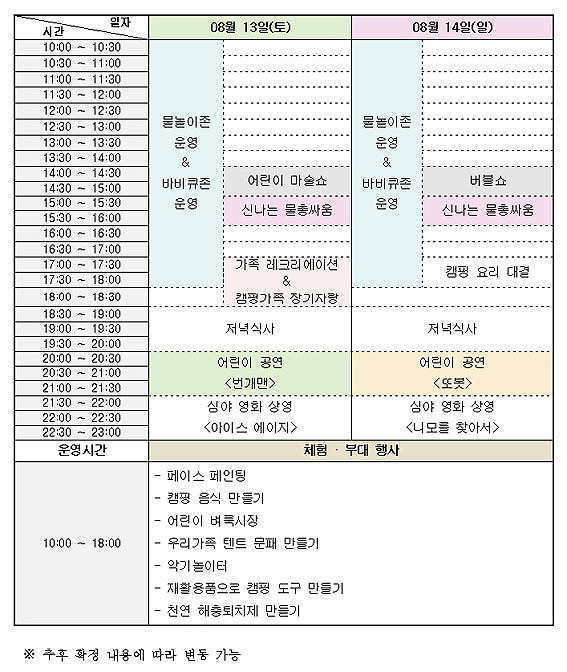 ƯÈ÷ ´õ¿î ³¯¾¾¸¦ °í·ÁÇÑ ¹°³îÀÌÁ¸ ¿î¿µÀ¸·Î ÈÞ°¡Ã¶ ½Ã¿øÇÏ°Ô º¸³¾ ¼ö ÀÖµµ·Ï ÁغñÇÏ°í ¾î¸°ÀÌ ´ë»ó üÇè Çà»çºÎÅÍ ÀÏ¹Ý ¼ºÀÎÀ» À§ÇÑ °ø¿¬±îÁö Àü ¿¬·ÉÃþÀÌ Âü¿©ÇÒ ¼ö ÀÖµµ·Ï ´Ùä·Î¿î ÇÁ·Î±×·¥À¸·Î ±¸¼ºµÆ´Ù.