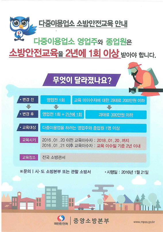 ¾Æ»ê¼Ò¹æ¼(¼Àå ÀÌÁ¾ÇÏ)´Â ¡®´ÙÁßÀÌ¿ë¾÷¼Ò ¾ÈÀü°ü¸®¿¡ °üÇÑ Æ¯º°¹ý¡¯ °³Á¤À¸·Î ´ÙÁßÀÌ¿ë¾÷¼Ò ¿µ¾÷ÁÖ¿Í Á¾¾÷¿ø¿¡ ´ëÇÑ ¼Ò¹æ¾ÈÀü±³À°(º¸¼ö±³À°)ÀÌ Ãß°¡µÊ¿¡ µû¶ó ´ÙÁßÀÌ¿ë¾÷¼Ò °ü°èÀÚ°¡ °¡Áú ¼ö Àִ ȥ¶õÀ» ¹Ì¿¬¿¡ ¹æÁöÇϰíÀÚ °³Á¤¹ý·É ¾È³»¡¤È«º¸¿¡ ÇÑâÀÌ´Ù.