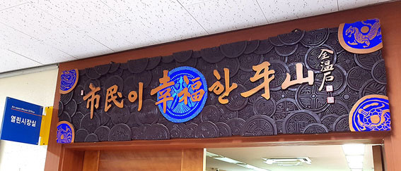 ¾Æ»ê½Ãû ¿¸°½ÃÀå½Ç ÃâÀÔ¹® À§¿¡ ÀÖ´Â ¡®½Ã¹ÎÀÌ ÇູÇÑ ¾Æ»ê¡¯ÀÌ Àü ÆÀÀåÀÇ ¼°¢ÀÛǰ ÁßÀÇ ÇϳªÀ̱⵵ ÇÏ´Ù.