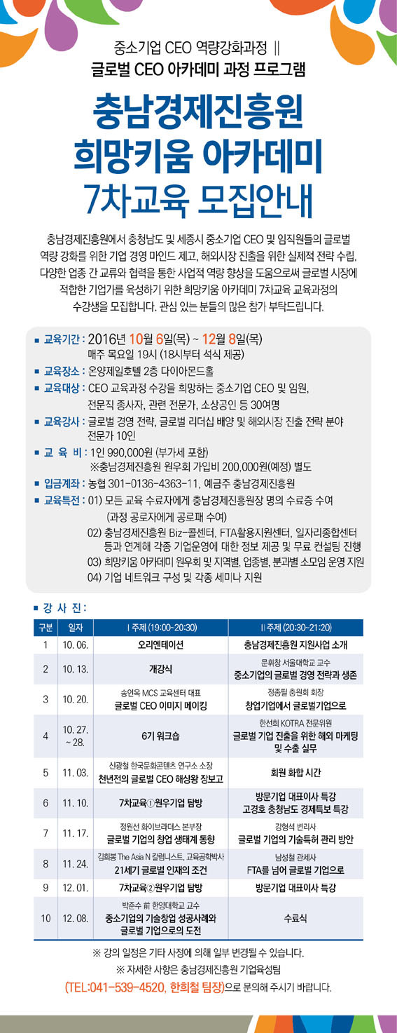 Èñ¸ÁŰ¿ò ¾ÆÄ«µ¥¹Ì 7Â÷ ±³À°´ë»óÀº ÃæÃ»³²µµ ¹× ¼¼Á¾½Ã ¼ÒÀç Áß¼Ò±â¾÷ CEO ¹× ÀÓ¿ø, Àü¹®Á÷ Á¾»çÀÚ, ¼Ò»ó°øÀÎ, °ü·Ã Àü¹®°¡ ¹× °ø¹«¿ø µîÀÌ´Ù.