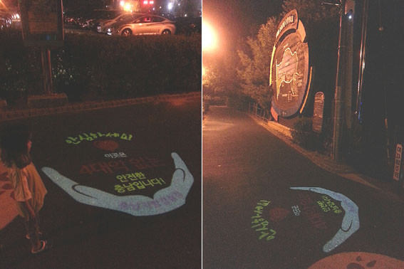 ·Î°íÁ§ÅÍ´Â À̹ÌÁö ±Û·¡½º¿¡ LED Á¶¸íÀ» Åõ»çÇØ º®¸éÀ̳ª ¹Ù´Ú¿¡ À̹ÌÁö³ª ÅØ½ºÆ®¸¦ Åõ¿µÇØ È«º¸ÇÏ´Â ½Å°³³ä ¹æ½ÄÀÌ´Ù. À̹ø¿¡ ¼³Ä¡µÈ ·Î°íÁ§ÅÍ´Â Àϸô ÈÄ ¾ß°£½Ã°£¿¡ º¼ ¼ö ÀÖÀ¸¸ç, ž籤À» ÀÌ¿ëÇØ »ç¿ëÇÏ´Â ¹æ½ÄÀÌ´Ù.
