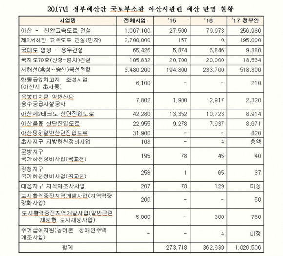 ° ÀÇ¿øÀÌ ¹àÈù ¡®2017³â Á¤ºÎ¿¹»ê¾È ±¹ÅäºÎ ¼Ò°ü ¾Æ»ê½Ã°ü·Ã ¿¹»ê ¹Ý¿µ ÇöȲ¡¯ ÀÚ·á¿¡ µû¸£¸é, Á¦2¼ÇØ¾È °í¼Óµµ·Î °Ç¼³Àº ´çÃÊ Ãæ³²µµ°¡ ¿ä±¸ÇÑ 1,500¾ï ¿øº¸´Ù 450¾ï ¿øÀÌ Ãß°¡ Áõ¾×µÈ 1,950¾ï ¿ø ¹Ý¿µµÆ°í, À½ºÀµðÁöÅÐ ÀϹݻê´Ü ¿ë¼ö°ø±Þ½Ã¼³°ø»ç´Â 23¾ï ¿øÀÌ ¹Ý¿µµÅ ÁذøÀÌ °¡´ÉÇÏ°Ô µÆ´Ù. ¾Æ»ê Á¦2Å×Å©³ë, ¾Æ»êÀ½ºÀ »ê´ÜÁøÀÔµµ·Î´Â °¢°¢ 89¾ï ¿ø, 88¾ï ¿øÀÌ ¹Ý¿µµÅ »ê´ÜÁøÀÔµµ·Î°¡ ³»³â¿¡ ¿Ï°øµÉ ¼ö ÀÖ°Ô µÆ´Ù. ¶ÇÇÑ ÅÁÁ¤ÀϹݻê´ÜÁøÀÔµµ·Î´Â ½Å±Ô»ç¾÷À¸·Î 8¾ï ¿øÀÌ ¹Ý¿µµÆ´Ù.